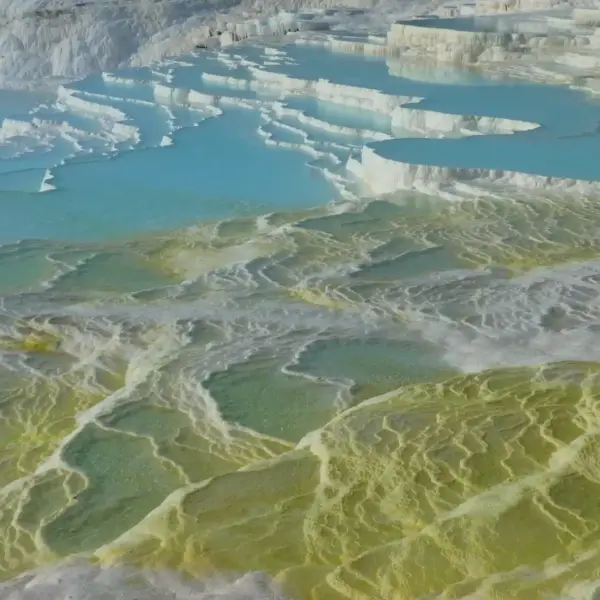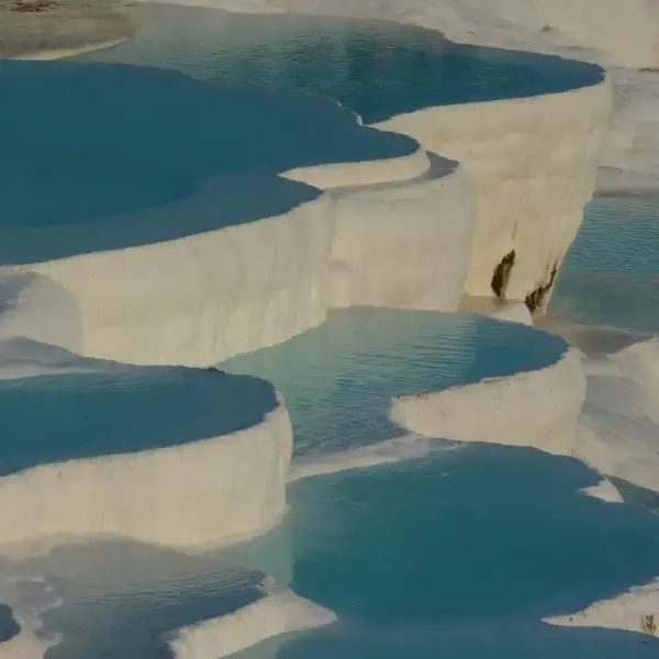 - 08:30 am, meet at your hotel to start your tour to Pamukkale “Cotton Castle”, once known as HIERAPOLIS, famous for healing thermal/ mineral baths and beautiful snow-white “petrified waterfalls”. After lunch, visit HIERAPOLIS, including the magnificently preserved Necropolis, the Main Street and Gates, the Thermal Baths, the Devil's Hole, and the Masterpiece Theater. Swimming or a therapeutic bath in a hotel pool's hot spring mineral waters (but not in the Cascade Pools) is one of your year-round options, before returning back to your hotel in Kusadasi. Overnight in Kusadasi